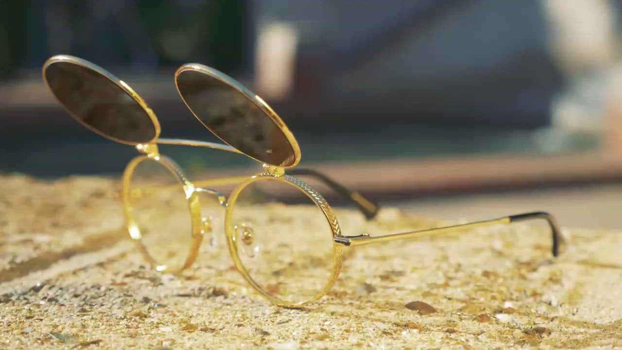 - Glossy black temple tips with gold 9FIVE monogram logo embedded on each temple tip