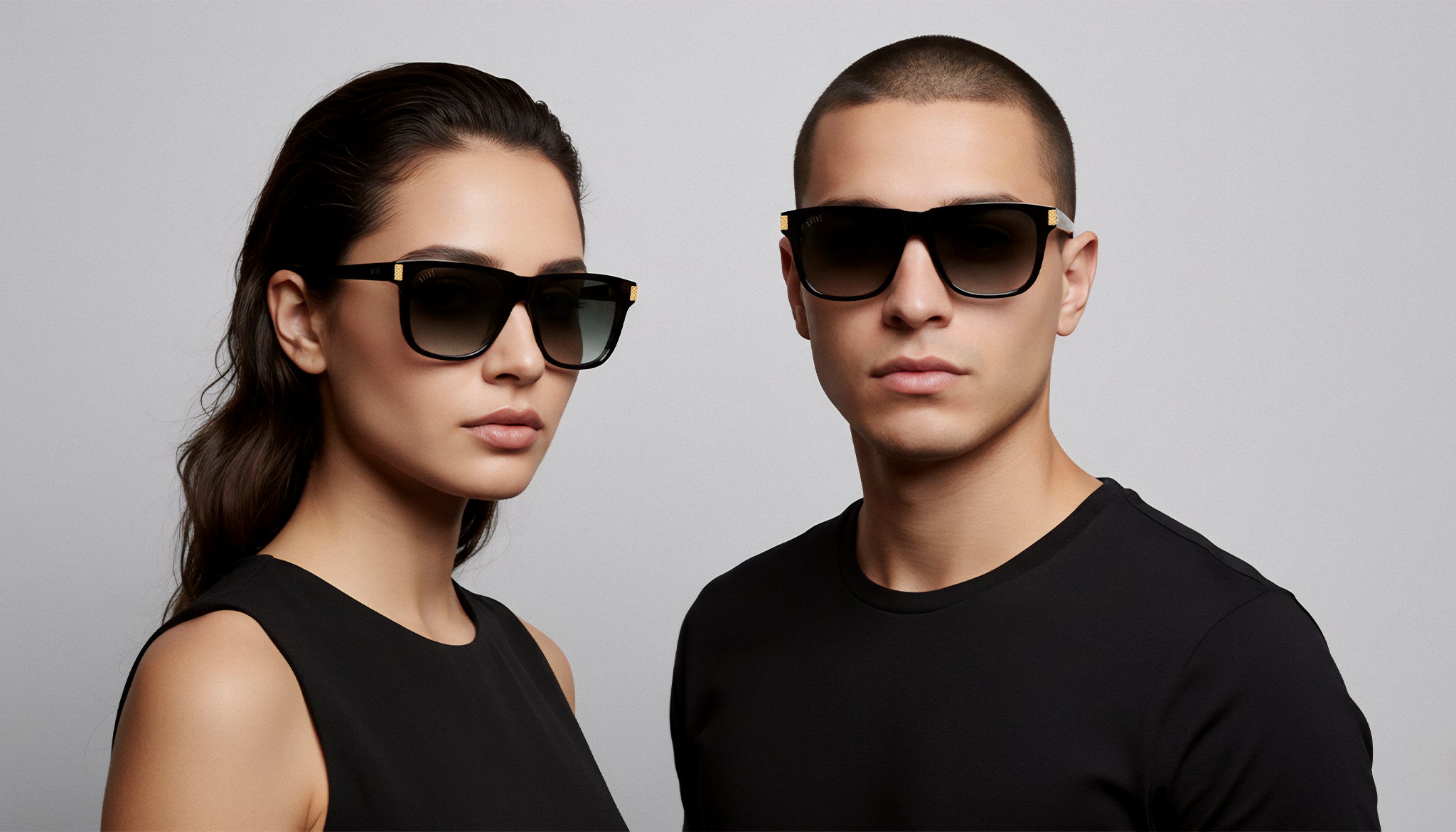 - Glossy black temples with embedded gold "95" coin in temple tip