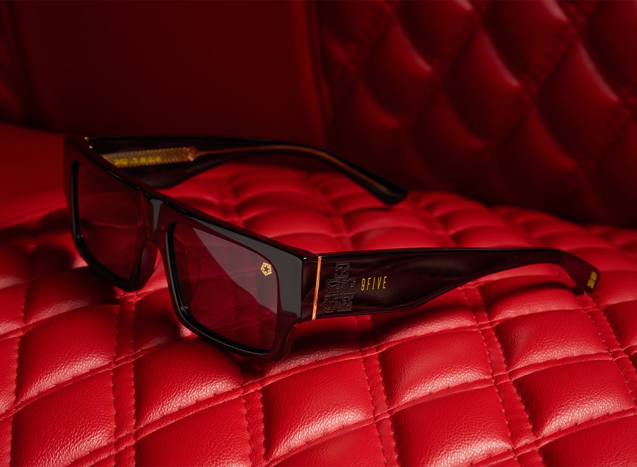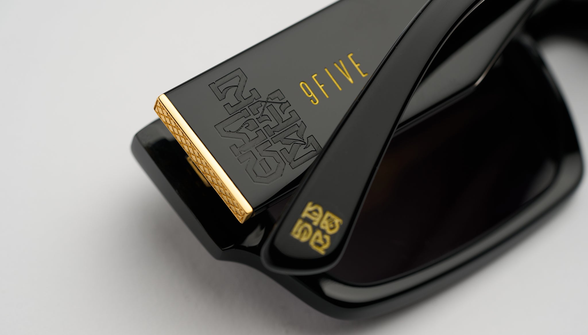 - Black CR-39 (100% UV Protection) lens with gold printed 9FIVE logo
