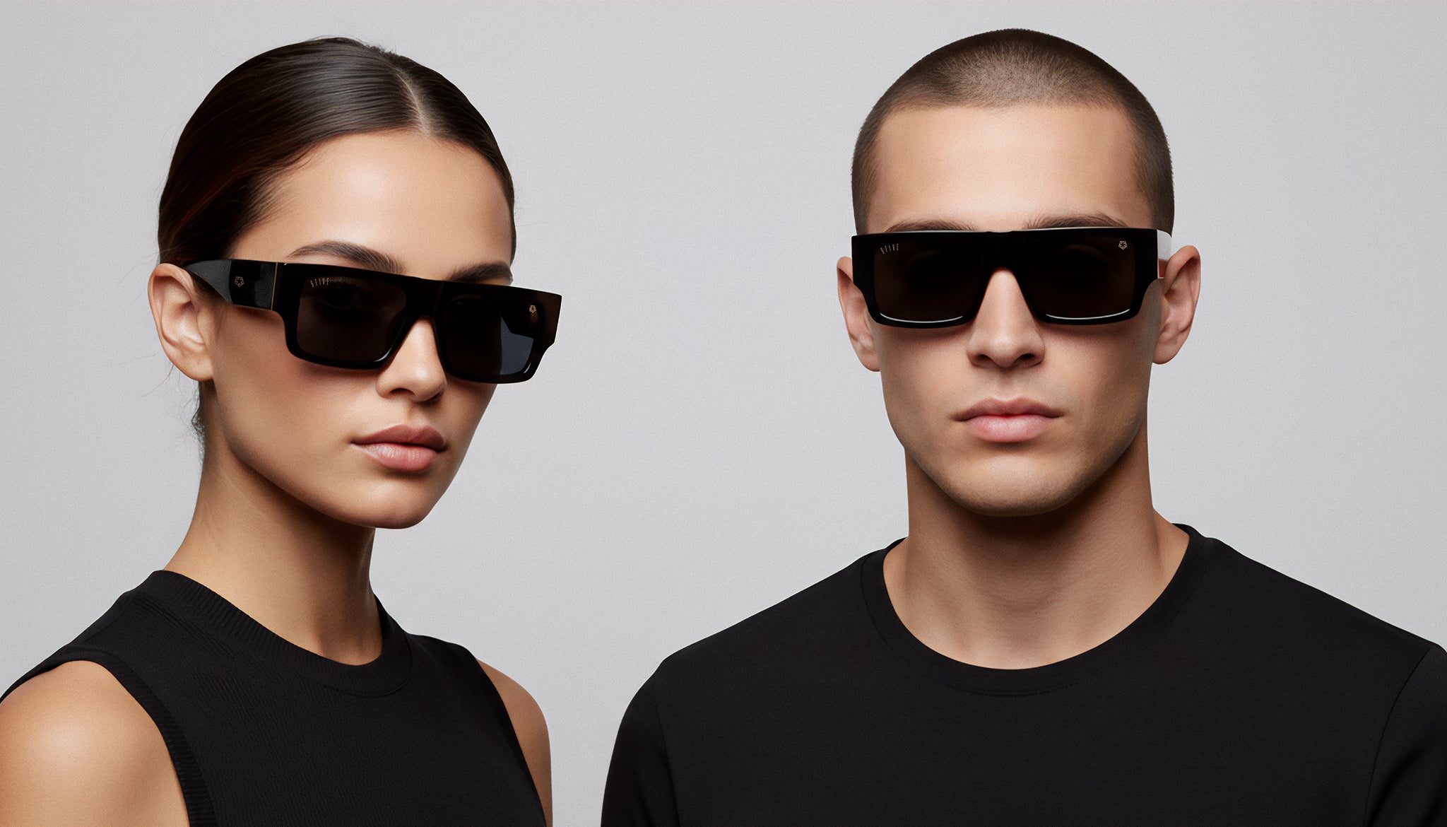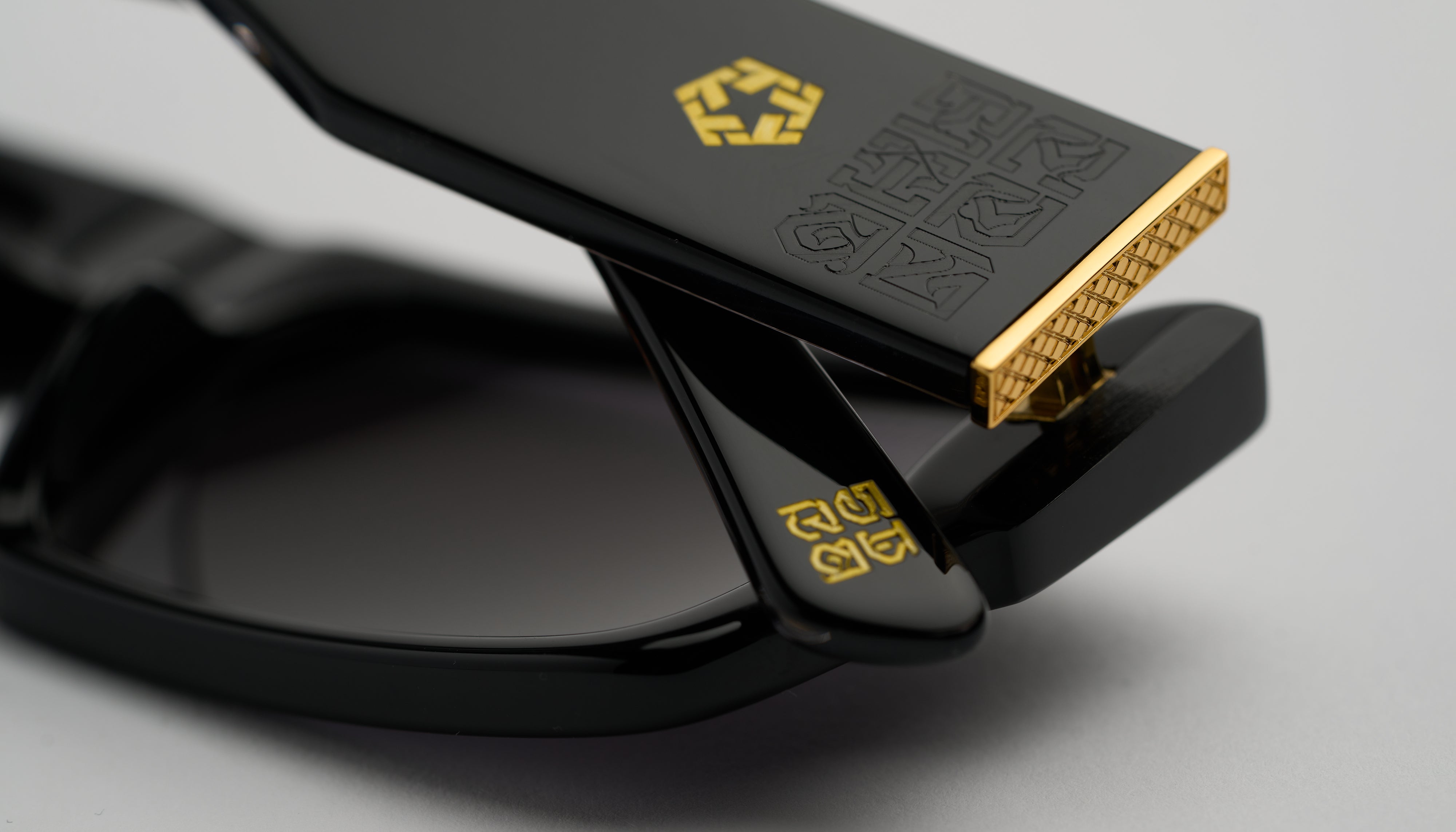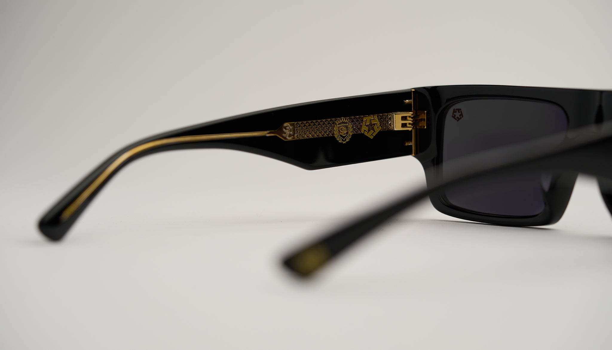- Glossy black frame and outer temples with 24k gold plated stainless steel accents