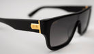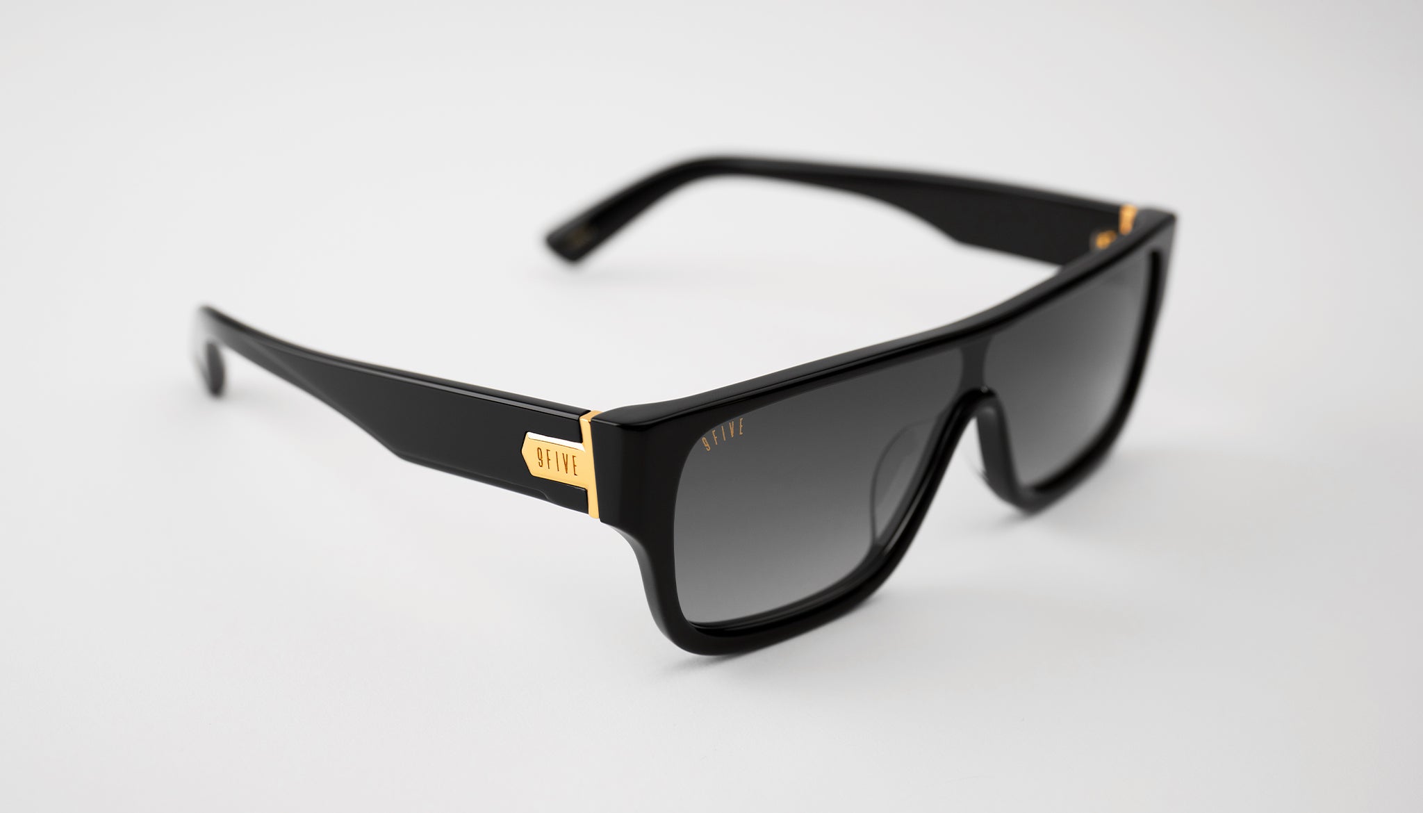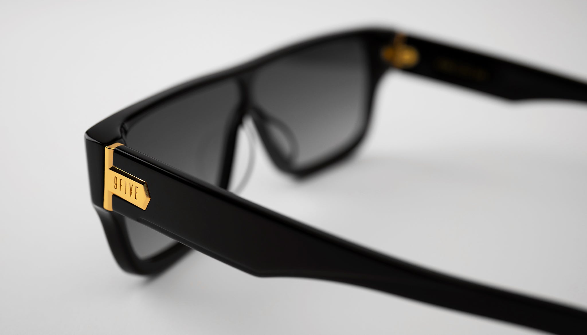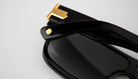 - Glossy black frame and temples with 24k gold plated stainless steel accents