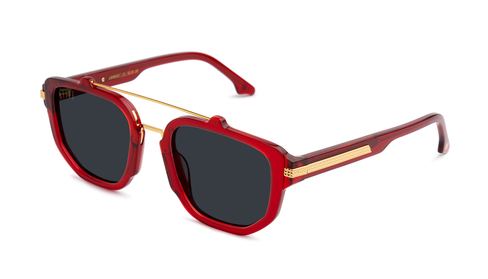- Polished ruby frame and temples with gold 9FIVE monogram logo embedded on each temple tip